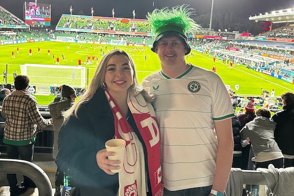 Rebecca MacFarlane, an ex-pat from the Toronto area, and her partner, Adam O’Reilly, who is from Ireland, attend the Canada-Ireland game in Perth, on July 26.Supplied