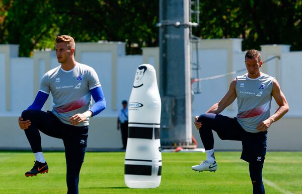 Iceland's goalkeepers Hannes Halldorsson, right, and Fredrik Schram attend a training session at Olimp Stadium in Kabardinka on June 14, 2018.JONATHAN NACKSTRAND/Getty Images
