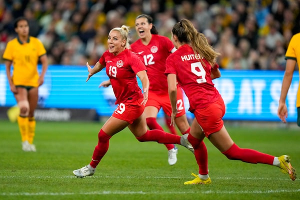 Canada's Adriana Leon celebrates with her teammates after scoring her team's second goal during a friendly soccer international between Canada and Australia in Sydney, Australia, Tuesday, Sept. 6, 2022.Rick Rycroft/The Associated Press