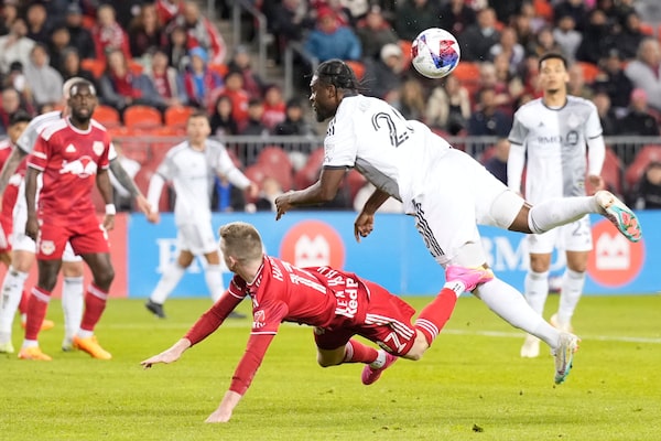 Toronto FC forward Ayo Akinola heads the ball over New York Red Bulls forward Cameron Harper during the second half at BMO Field on May 17.Kevin Sousa/USA TODAY Sports via Reuters