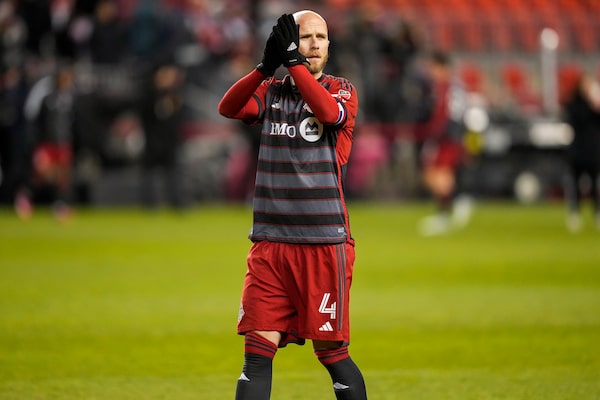 Toronto FC captain Michael Bradley salutes the crowd after a game against Charlotte FC, in Toronto, on April 1.Andrew Lahodynskyj/The Canadian Press