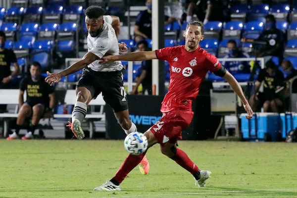 Montreal Impact's Anthony Jackson-Hamel, left, shoots at goals as Toronto FC defender Omar Gonzalez (44) defends during the second half of an MLS soccer match, Thursday, July 16, 2020, in Kissimmee, Fla.John Raoux/The Associated Press