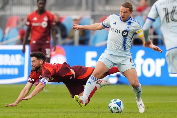 CF Montreal's Samuel Piette (right) knocks Toronto FC's Jonathan Osorio off the ball in Toronto on April 30, 2025.Frank Gunn/The Canadian Press