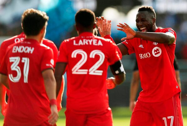 Toronto FC's Jozy Altidore celebrates Richie Laryea's goal against the San Jose Earthquakes during a game in San Jose on Feb. 29, 2020.The Associated Press