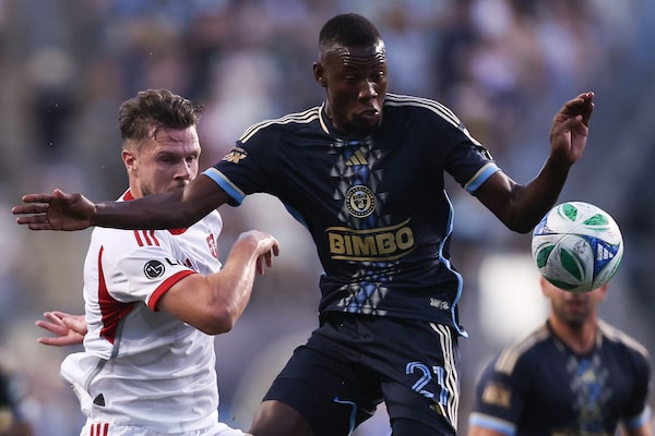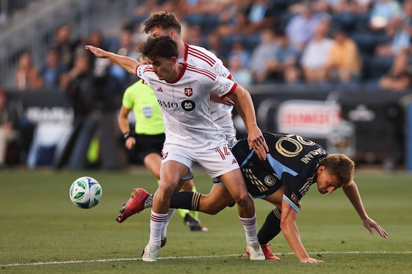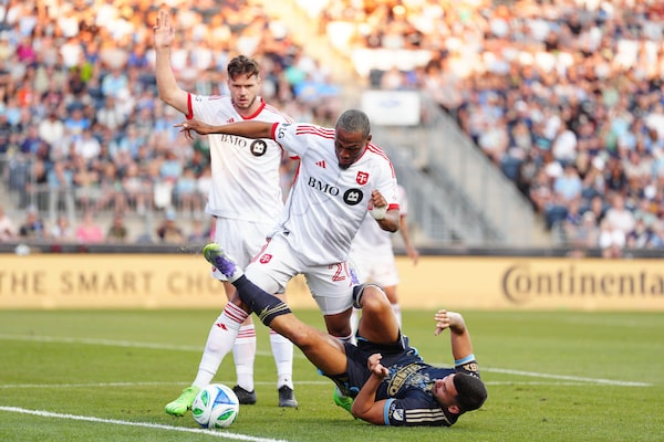 Philadelphia Union's Tai Baribo falls to the ground as he struggles for the ball against TFC's Deybi Flores.Derik Hamilton/The Associated Press