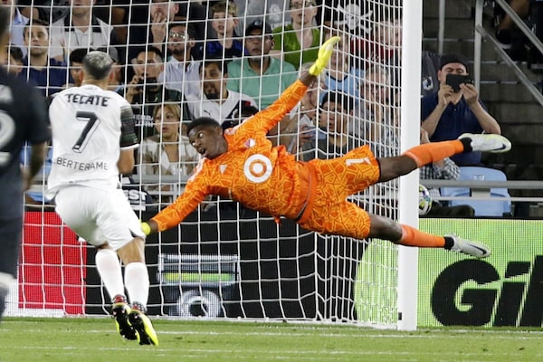 FILE - MLS All-Star goalkeeper Sean Johnson (1) dives for the ball as Liga MX All-Star Sebastián Driussi watches during the second half of the MLS All-Star soccer match Wednesday, Aug. 10, 2022, in St. Paul, Minn. Sean Johnson is the new goalkeeper for Toronto FC through 2024. The 33-year-old free agent spent the last six seasons with New York City FC.(AP Photo/Andy Clayton-King, File)The Canadian Press