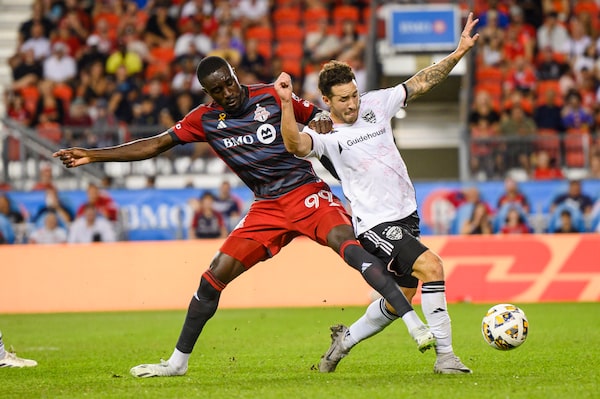 Toronto FC forward Prince Osei Owusu battles for the ball with D.C. United defender Aaron Herrera during a match in Toronto, on Aug. 31.Christopher Katsarov/The Canadian Press