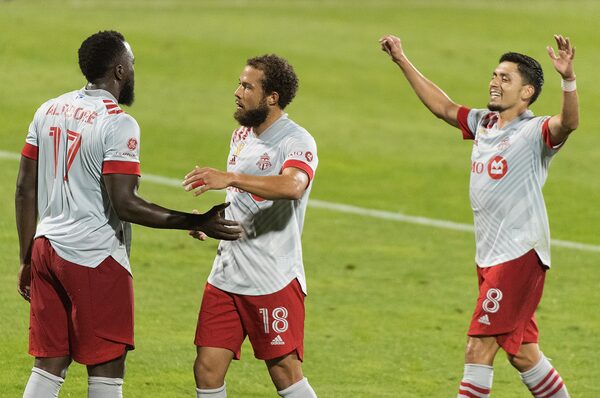 Toronto FC’s Jozy Altidore celebrates with teammates Nick DeLeon and Mark Delgado after scoring during a game against the Montreal Impact on Sept. 9, 2020.Graham Hughes/The Canadian Press