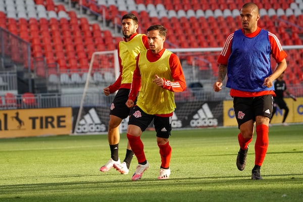 Alejandro Pozuleo, left to right, Pablo Piatti and Brazil’s Auro Jr. take part in team training at BMO Field in Toronto on June 26, 2020.HO/The Canadian Press