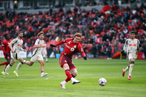Toronto FC striker Josh Sargent takes a shot on goal during his debut for the club against the New York Red Bulls at Toronto's BMO Field last month.Vaughn Ridley/Getty Images