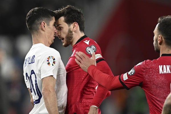 Georgia's Khvicha Kvaratskhelia, centre, argues with Greece's Petros Mantalos during the Euro 2024 qualifying play-off soccer match between Georgia and Greece at the Boris Paichadze National Stadium in Tbilisi, Georgia. Georgia won 4-2 on March 26, 2024.The Associated Press