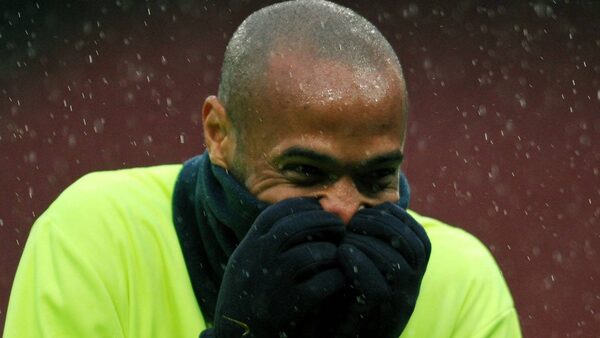 Barcelona's French forward Thierry Henry gestures while practicing in the rain during a training session at The Emirates Stadium in London on March 30, 2010. Barcelona are to play Arsenal in the quarter-final of the Champions League Wednesday. Getty Images / Adrian DennisADRIAN DENNIS/Getty Images