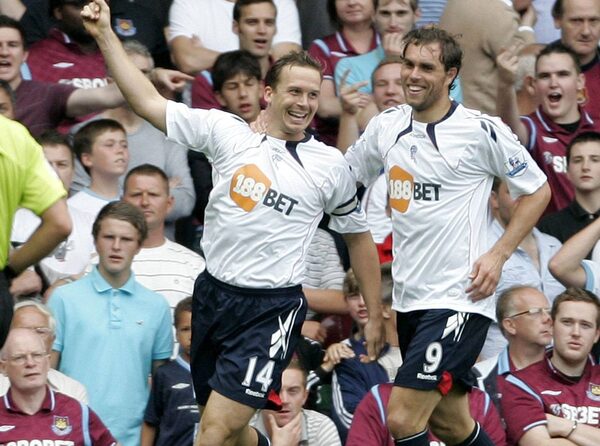 Bolton Wanderers' Kevin Davies, left, and Johan Elmander celebrate an own goal by West Ham United's Matthew Upson, unseen, during their English Premier League soccer match at Upton Park in London, Saturday, Aug. 21, 2010. (AP Photo/Akira Suemori)Akira Suemori/The Associated Press