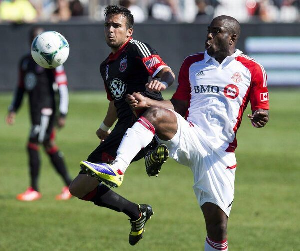 Toronto FC forward Bright Dike and D.C. United midfielder Dennis Iapichino battle for a ballFrank Gunn/The Canadian Press