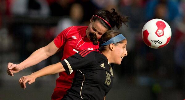 Mexico's Guadalupe Worbis, right, and Canada's Rhian Wilkinson vie for the ball during the first half of a women's international friendly soccer game in Vancouver, B.C., on Sunday November 24, 2013.DARRYL DYCK/The Canadian Press