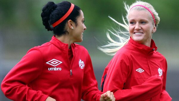 Jonelle Filigno (L) of Canada and Kaylyn Kyle (R) smile during the Canada Women national team training session at Mommsen stadium on June 24, 2011 in Berlin, Germany. (Photo by Martin Rose/Bongarts/Getty Images)Martin Rose/Getty Images