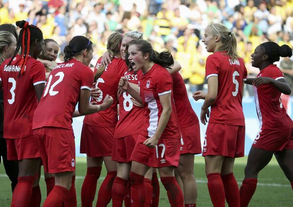 Canadian celebrate players celebrate a win against Brazil on Aug. 19, 2016.PAULO WHITAKER/Reuters