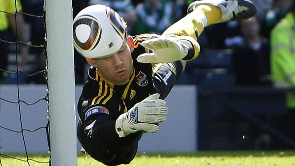 Ross County's goalkeeper Michael McGovern tries to save a header from Celtic's Marc-Antoine Fortune during their Scottish Cup semi-final soccer match at Hampden Park stadium in Glasgow, Scotland April 10, 2010.DAVID MOIR/Reuters
