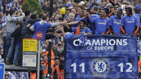 Football fans standing on a bus shelter stretch their hands to congratulate Chelsea players during a victory parade along the Kings Road, after the Champions League final victory against Bayern Munich, in Chelsea, west London May 20, 2012.Reuters