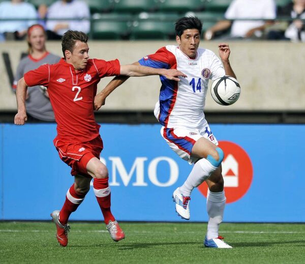 Costa Rica's Christopher Meneses, right, and Canada's Nik Ledgerwood fight for the ball during their international friendly soccer match in Edmonton May 28, 2013. The two national teams are preparing for the CONCACAF Gold Cup in July.DAN RIEDLHUBER/Reuters