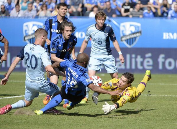 Montreal Impact goalkeeper Troy Perkins (1) makes a save as Sporting KC midfielder Oriol Rosell (20) and Montreal Impact midfielder Collen Warner (18) look on during the first half at Stade Saputo.Eric Bolte