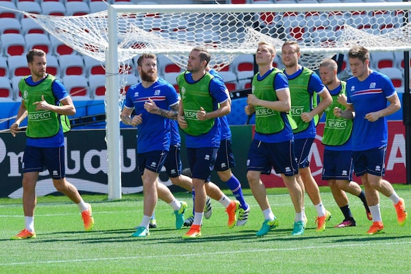 The Iceland team trains at the Allianz Riviera stadium in Nice, France, on Sunday. Iceland meets England for a round of 16 match in the European Championship on Monday.TOBIAS SCHWARZ/AFP / Getty Images