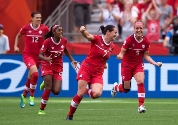 Canada's Christine Sinclair, centre, celebrates with teammates (from left) Ashley Lawrence, Rhian Wilkinson and Josee Belanger after Belanger's goal against Switzerland during the second half of the FIFA Women's World Cup round of 16 soccer action in Vancouver June 21.DARRYL DYCK/The Canadian Press