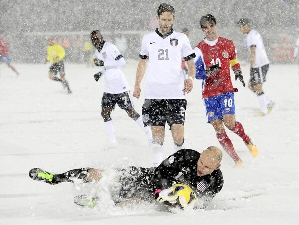 Goalkeeper Brad Guzan of the U.S. makes a sliding stop in the snow during their 2014 World Cup qualifying soccer match against Costa Rica in Commerce City, Colorado March 22, 2013. Costa Rica is protesting their 1-0 loss due to the playing conditions.MARK LEFFINGWELL/Reuters