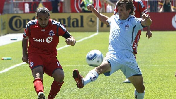 Dwayne De Rosario #14 of the Toronto FC battes with Wells Thompson #15 of the Colorado Rapids during a MLS game at BMO Field July 10, 2010 in Toronto.Abelimages/Getty Images