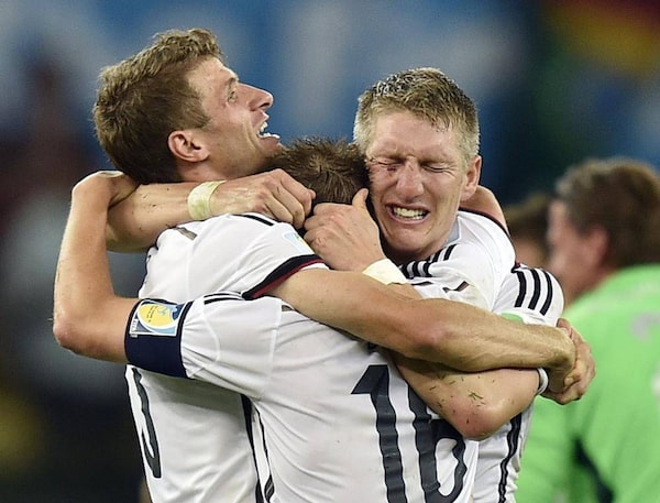 Germany's Thomas Mueller, left, Bastian Schweinsteiger, right, and Philipp Lahm (16) embrace after the game.MARTIN MEISSNER/The Associated Press