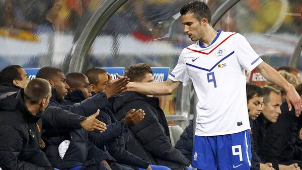 Netherlands' Robin van Persie greets team mates after he was substituted during a 2010 World Cup Group E soccer match against Cameroon at Green Point stadium in Cape Town June 24, 2010. REUTERS/Jerry LampenJERRY LAMPEN/Reuters