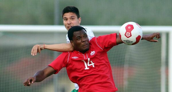 Canada's Cyle Larin, front, challenges for a ball with Ilia Milanov, back, of Bulgaria during a friendly soccer match between Canada and Bulgaria, in Ritzing, Austria, Friday, May 23, 2014.Ronald Zak/The Associated Press