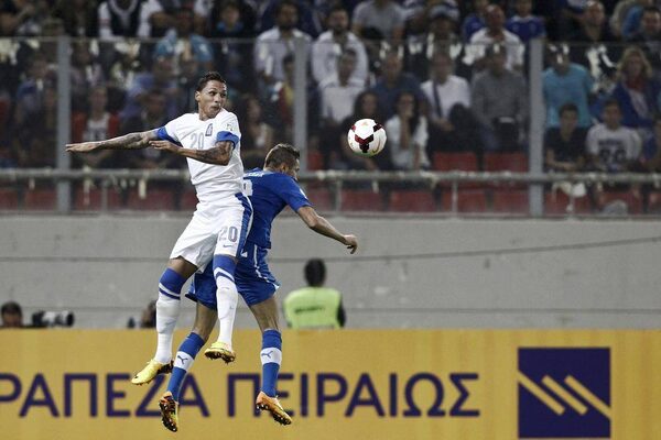 Slovakia's Stanislav Sestak challenges Greece's Chose Cholebas during their 2014 World Cup qualifying soccer match at Karaiskaki Stadium in Piraeus, near Athens October 11, 2013.YORGOS KARAHALIS/Reuters