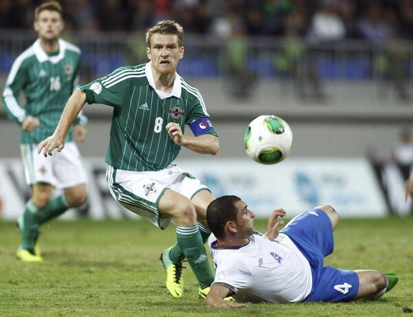 Mahir Shukurov, right, of Azerbaijan challenges Steven Davis of Northern Ireland during their 2014 World Cup qualifying soccer match in Baku October 11, 2013.DAVID MDZINARISHVILI/Reuters