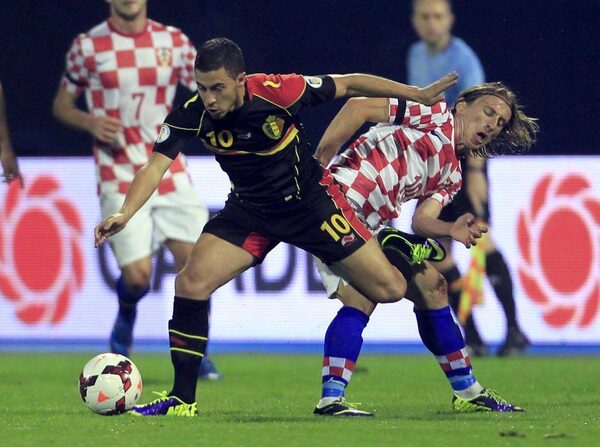 Belgium's Eden Hazard, left, is challenged by Croatia's Luka Modric during their 2014 World Cup qualifying soccer match at Maksimir stadium in Zagreb October 11, 2013.ANTONIO BRONIC/Reuters