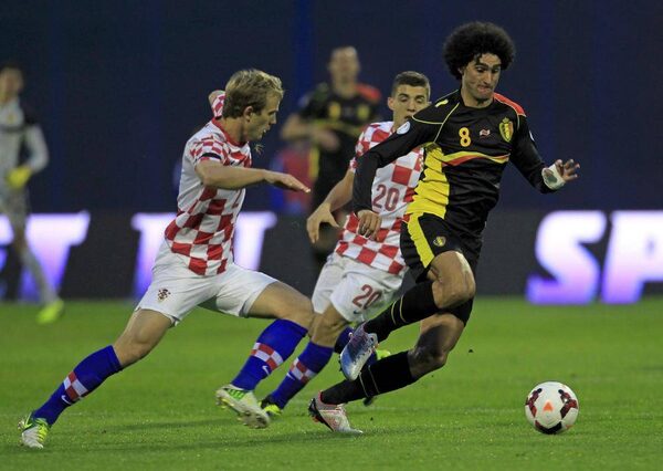 Belgium's Marouane Fellaini, right, is challenged by Croatia's Ivan Strinic and Mateo Kovacic during their 2014 World Cup qualifying soccer match at Maksimir stadium in Zagreb October 11, 2013.ANTONIO BRONIC/Reuters