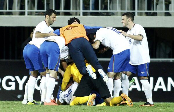 Azerbaijan's players celebrate the goal of Mahir Shukurov (bottom) against Northern Ireland during their 2014 World Cup qualifying soccer match in Baku October 11, 2013.DAVID MDZINARISHVILI/Reuters