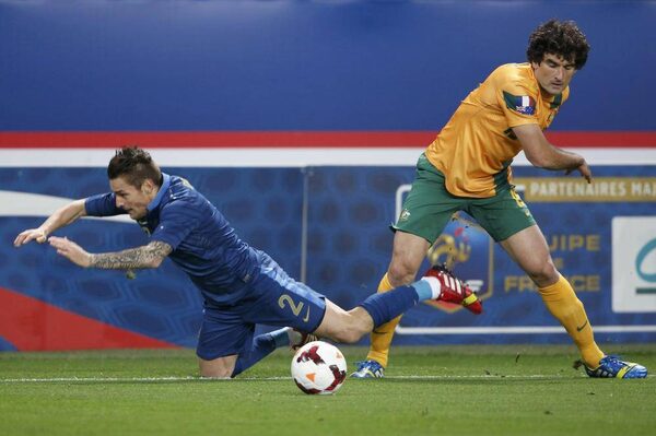France's Mathieu Debucky, left, challenges Australia's Mile Jedinak during their friendly soccer match at the Parc des Princes stadium in Paris, October 11, 2013.CHARLES PLATIAU/Reuters