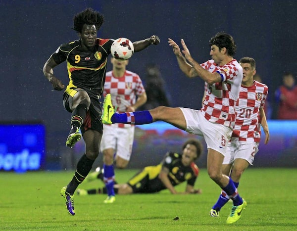 Belgium's Romelu Lukaku, left, is challenged by Croatia's Vedran Corluka during their 2014 World Cup qualifying soccer match at Maksimir stadium in Zagreb October 11, 2013.ANTONIO BRONIC/Reuters