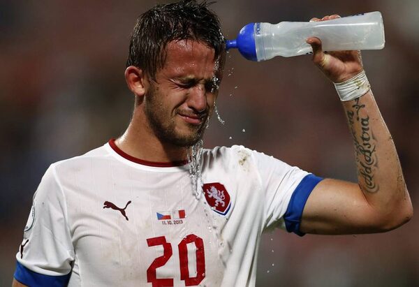 Czech Republic's Tomas Pekhart squirts water onto his face after injuring himself while scoring a goal against Malta during their 2014 World Cup qualifying soccer match at the National Stadium in Ta' Qali, outside Valletta, October 11, 2013.Reuters