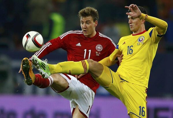 Romania's Florin Gardos, right, fights for the ball with Denmark's Nicklas Bendtner during their international friendly soccer match at National Arena in Bucharest November 18, 2014.BOGDAN CRISTEL/Reuters