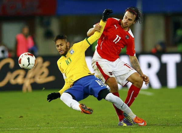 Austria's Martin Harnik challenges Neymar of Brazil during their international friendly soccer match at Ernst Happel stadium in Vienna.LEONHARD FOEGER/Reuters