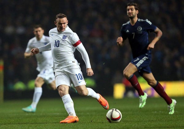 England's captain Wayne Rooney, left, takes a shot towards goal past Scotland's Charlie Mulgrew, right, during their international friendly soccer match at Celtic Park, Glasgow, Scotland, Tuesday Nov. 18, 2014.Scott Heppell/The Associated Press