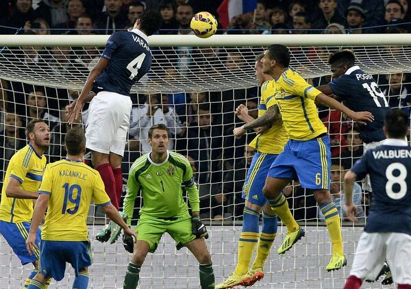 French defender Raphael Varane, left, jumps for the ball during the friendly match France vs Sweden on November 18, 2014 at the Velodrome stadium in Marseille, southern France.FRANCK FIFE/AFP / Getty Images