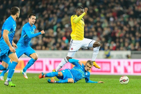 Colombia's Jackson Martinez fights for the ball with Slovenian defenders on November 18, 2014 during an international friendly football match between Slovenia and Colombia in Ljubljana.JURE MAKOVEC/AFP / Getty Images