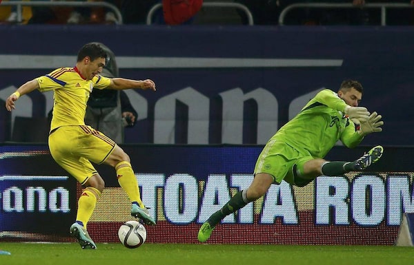 Romania's Claudiu Keseru, left, shoots to score a goal past Denmark's goalkeeper Stephan Andersen during their international friendly soccer match at National Arena in Bucharest November 18, 2014.BOGDAN CRISTEL/Reuters