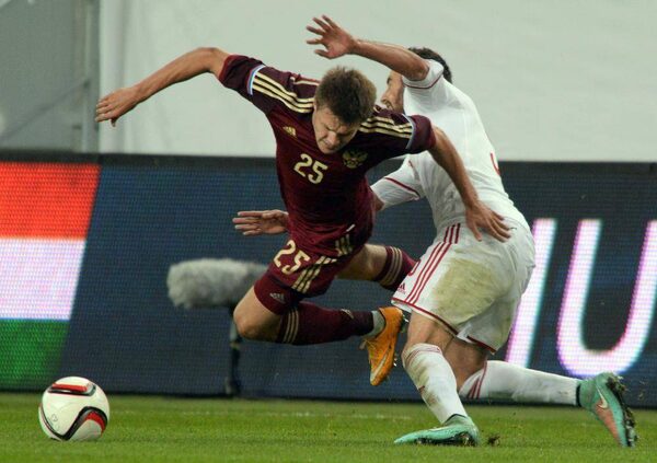 Russia's forward Maksim Kanunnikov, left, vies with Hungary's defender Attila Fiola during a friendly football match Hungary vs Russia at Groupama Arena in Budapest on November 18, 2014.ATTILA KISBENEDEK/AFP / Getty Images