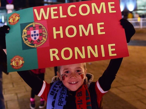 A boy holds a sign welcoming former Manchester United player Portugal's striker Cristiano Ronaldo ahead of the international friendly match between Argentina and Portugal at Old Trafford in Manchester.PAUL ELLIS/AFP / Getty Images