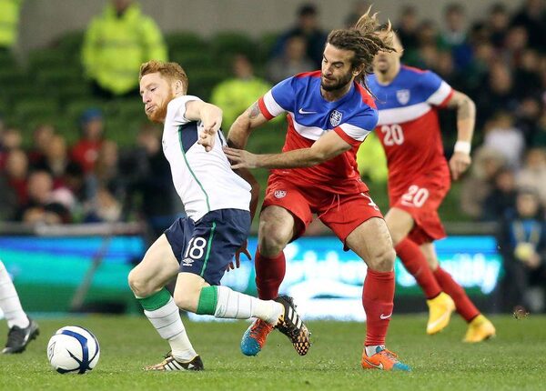 Republic of Ireland's midfielder Stephen Quinn, left, pulls away from United States' midfielder Kyle Beckerman during the international friendly match between the Republic of Ireland and the United States at the Aviva Stadium in Dublin on November 18, 2014.PAUL FAITH/AFP / Getty Images