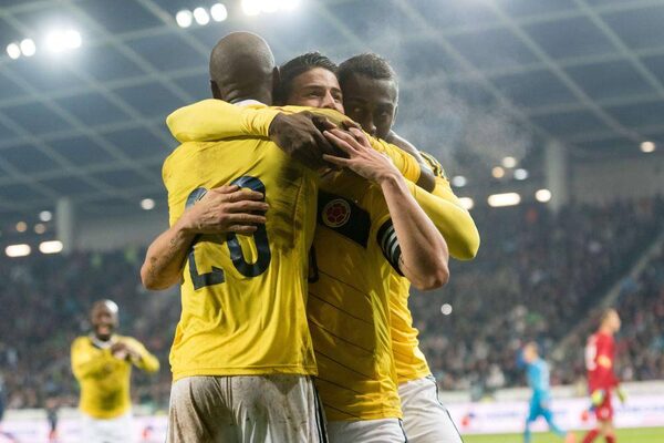 Colombia players celebrate after scoring against Slovenia on November 18, 2014 during an international friendly soccer match.JURE MAKOVEC/AFP / Getty Images